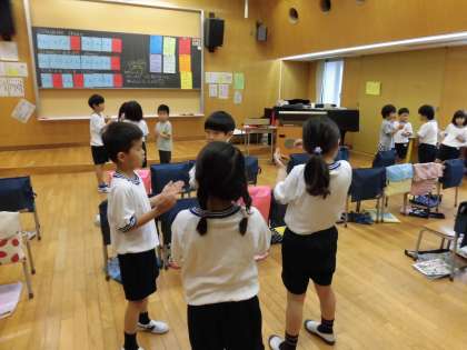 選んだリズムのチームごとに練習します。他のチームはやさしい声で歌います。