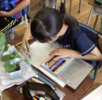 6月11日(火)3校時、5年3組の子供たちは理科を学習しました。今日は、育ってきたインゲンマメの成長を観察し、気付いたことをノートにまとめました。