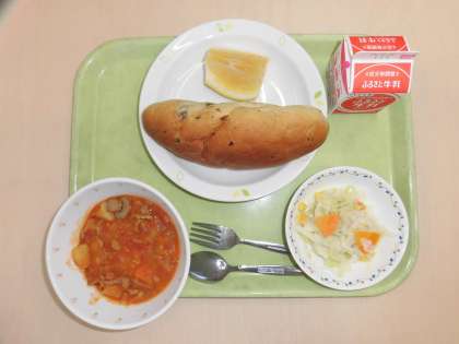 献立は、ぶどうパン、トマトシチュー、コーンサラダ、美生柑、牛乳です。