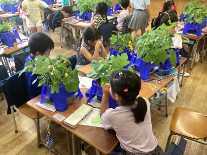 6月12日(水)4校時、1年2組の子供たちは生活科の学習をしました。この日は、大きくなってきた「アサガオ」の観察をしていました。虫眼鏡を使って、葉や根や茎をよく観ていました。気付いたことをワークシートにすすんでまとめていました。早く花が咲くといいですね。