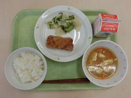 献立は、ごはん、いかのかりんとあげ、麻婆汁、大根ときゅうりのごま風味、牛乳です。