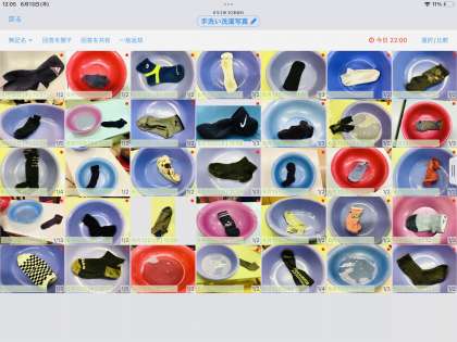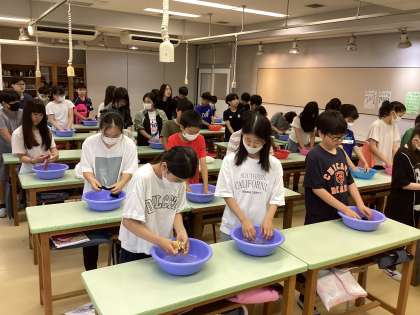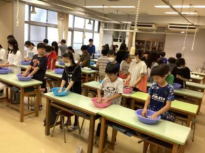 水や洗剤の量を計って洗面器に入れ、もみ洗いをしました。