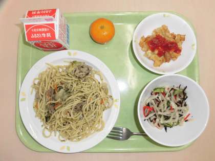 献立は、和風スパゲッティ、大根とひじきのサラダ、大豆とウインナーのフリッター、冷凍みかん、牛乳です。