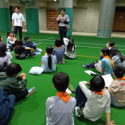 クラスごとナイトハイク出発前に、川場村にいる動物の話を聞いています。