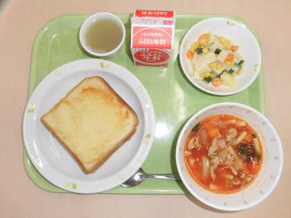 献立は、ガーリックトースト、ミネストローネ、マセドアンサラダ、りんごゼリー、牛乳です。