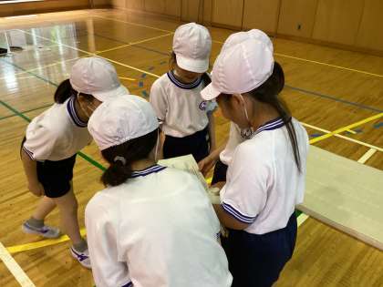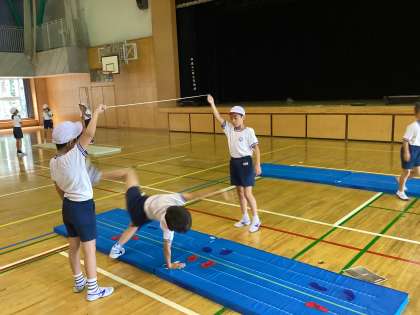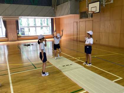 7月1日(月)2校時、5年3組の子どもたちはマット運動の学習を体育館で取り組みました。この日は、回転系の技である「側方倒立回転」とその発展技である「ロンダード」を学習し、その後は、発表会に向けて練習を重ねました。トリオになって教え合ったり、資料集で技のポイントを確認したりする姿に成長を感じました。発表会も楽しみです。