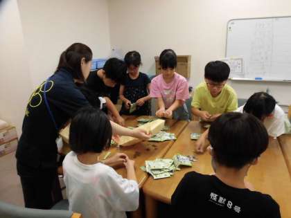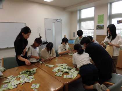写真は、代表委員が集まったお金を封筒から出して分けているところです。