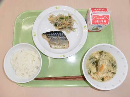 献立は、ごはん、さばの一味焼き、カリカリ油揚げと野菜のひたし、かきたま汁、牛乳です。