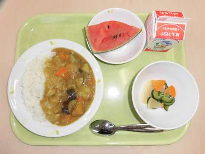 献立は、夏野菜チキンカレーライス、シャキシャキ野菜、小玉スイカ、牛乳です。