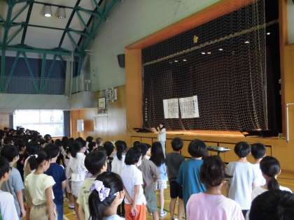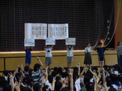 次に、「大きなうた」を全校で先に歌うパートと追いかけるパートに分かれて歌いました。