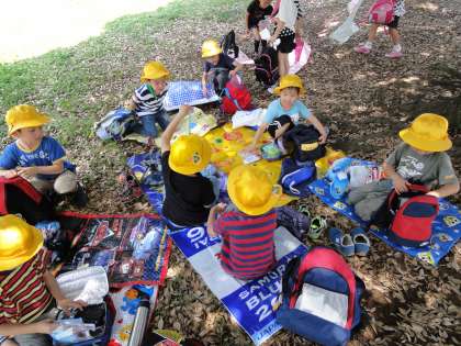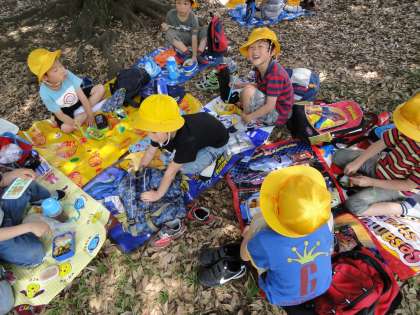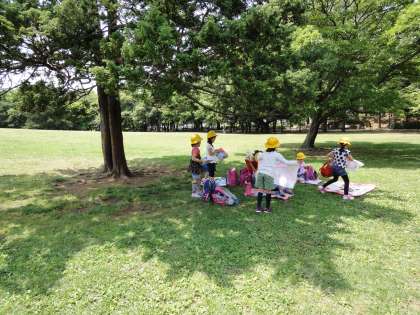 お友達と集まってビニールシートをしき、楽しくおいしくお弁当を食べました。