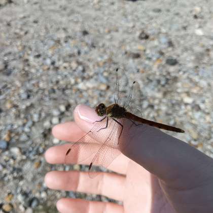 私の手にトンボがとまりました。
