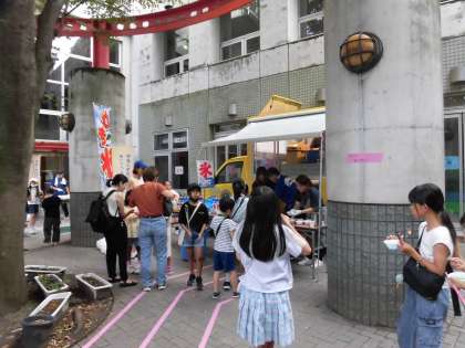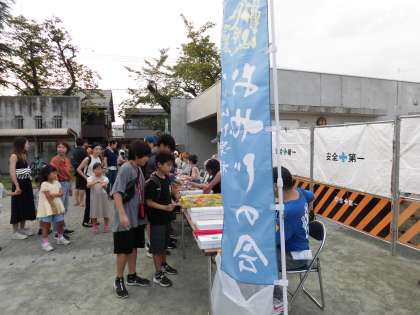 上:続々と子どもたちが受付をしています。一人5本、手持ち花火がもらえます。
