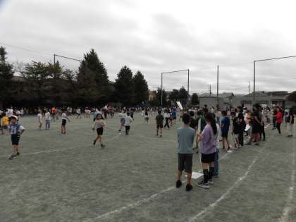 今朝は児童集会です。校庭でたてわり班ごとに宝(色紙)を探して集めます。