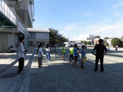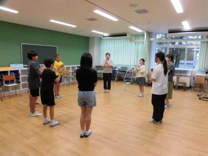 右:全校ダンス、「八幡山音頭」の練習をしています。