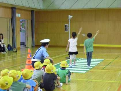 交通ルールについてお話を聞いたり、実際に道の渡り方の練習をしたりしました。