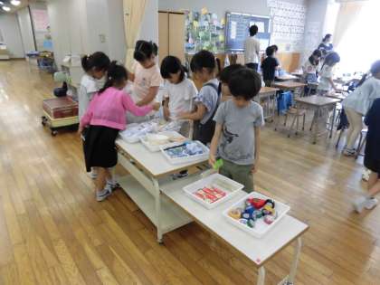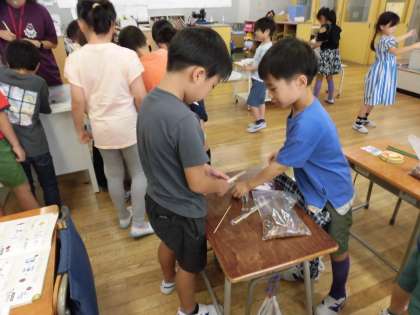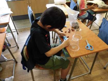 先日の生活科見学で見つけてきた「秋らしいもの」を使って、おもちゃを作っています。