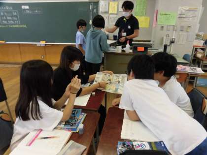 写真は台所の様子イラストから工業製品を見つけているところです。身の回りのもののほとんどが工業製品であることが分かりました。また、昔と今の工業製品の様子から、工業製品により私たちの生活がよくなってきていることにも気が付きました。