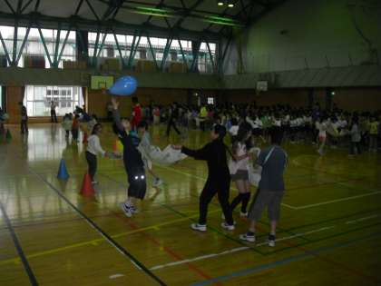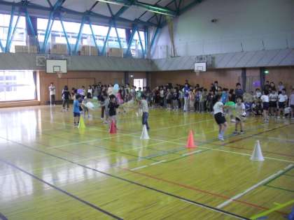 今日の児童集会は「風船運び集会」でした。