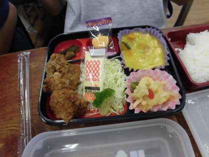 右:学校でお弁当を注文した人のメニューです。今日はハロウィンメニューで、フライドチキンが2つも入っていて豪華です。注文した子もたくさんいました。