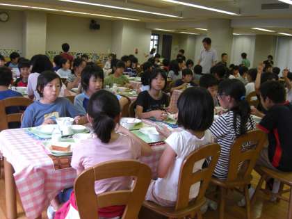 ランチルームで学年いっしょに給食をとる学年交流給食が始まりました。今日は、15日(金)に続いて5年生です。7月6日まで、各学年2日ずつ行います。座席も交流できるよう工夫しています。