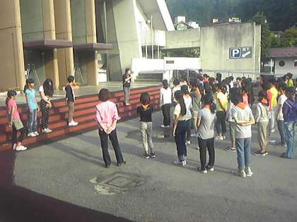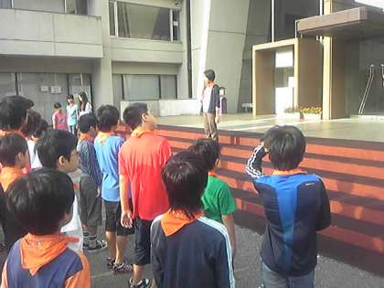 近くの駐車場で朝会をしました。体操は係の子どもたちの