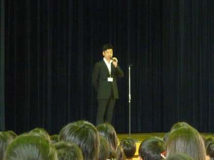 始業式に先立って、校長先生の着任式を行いました。土性知法(どしょうとものり)校長先生よりあいさつがあり、子どもたちは、「新しい校長先生はどんな人だろう?」