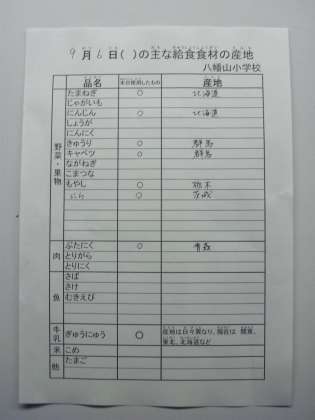 9月6日の給食食材の産地です。