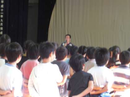 集会の後、生活指導担当の吉沢先生より、学校に忘れ物をした時の忘れものを取りに教室に行くときの約束の変更のお話がありました。教室に行く前と後に、職員室に寄ることになりました。受付でのノートに書くのは、今までと同じです。安全確保の理由からこのようにいたします。学校から帰る時に忘れ物をしないよう学校でもいっそう子どもたちに注意を喚起していきます。