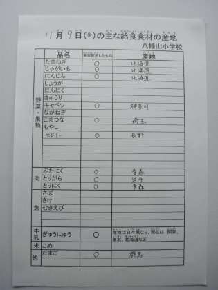 11月9日の主な給食食材の産地です。