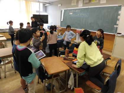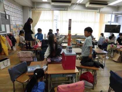 お家から持ってきたいろいろな大きさの「かたち」を積み重ねています。積み重ねてできたかたちをタブレットで写真に撮りました。