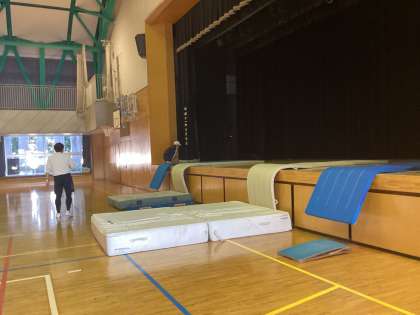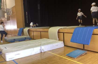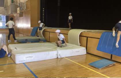 11月25日(月)3校時、5年3組の子供たちは体育館で体育の学習に取り組んでいました。この日は、跳び箱運動。大きな台上前転の発展技である「首はね跳び」の感覚づくりに挑戦しました。「首はね跳び」のポイントを意識しながら、舞台とエバーマットを使って練習に励みました。跳び箱で「首はね跳び」ができた子もおり、みんなが褒めていました。みんな、意欲的に頑張っていました。