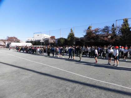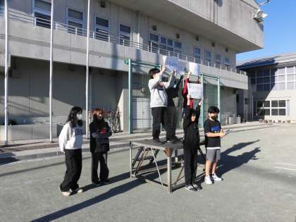 今朝は児童集会です。クイズに正解すると前のラインに進み、間違えると後ろのラインに戻るというルールです。