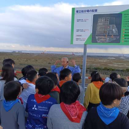見晴らし広場から、作っている途中の処分場を見ています。あと50年で埋め立てる場所が無くなるそうです。
