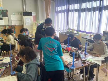 12月6日(金)1・2校時、5年3組の子供たちは理科「ふりこの性質」の学習をしました。「ふりこの一往復する時間は何によって変わるのか」を学習課題に、ふりこの長さやおもりの重さを変えて、実験に取り組みました。一人一台の実験器具を使い、子供たちは夢中で調べていました。わくわくしながら実験する子供たち。とてもすてきです。