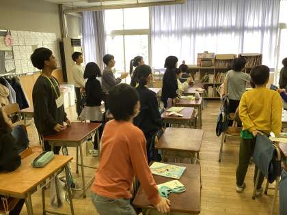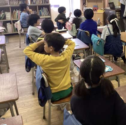 12月20日(金)5校時、4年4組の子供たちは外国語活動の学習に取り組みました。この日は、ALTの先生から、この季節の代表的な英語の歌を習いました。途中で、その歌の歌詞に関するクイズも出され、子供たちは大盛り上がり。歌詞を身近に感じたのか、すてきな歌声を響かせていました。元気な4年生。すてきです。