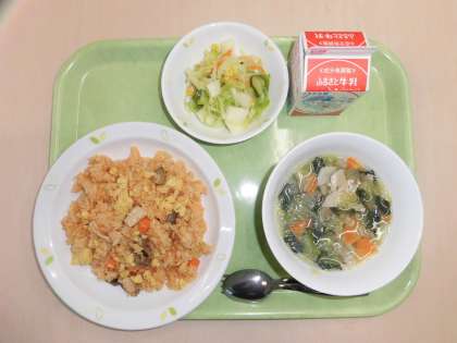 献立は、チキンライスたまご添え、カレードレッシングサラダ、白菜の和風スープ、牛乳です。