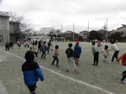 写真は外でドッジボールをする班、室内でばくだんゲームと絵しりとりをする班の様子です。他にも、なんでもバスケットや伝言ゲームで盛り上がっていました。