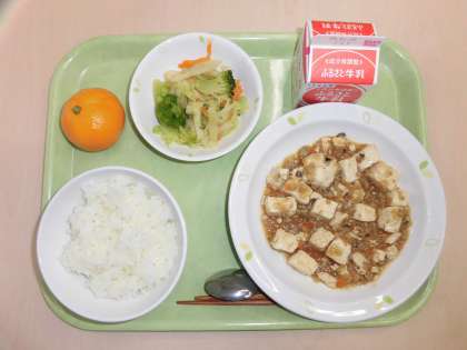 献立は、ごはん、麻婆豆腐、ブロッコリーの中華和え、みかん、牛乳です。