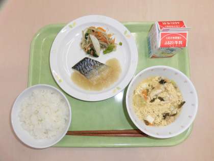 献立は、有機米ごはん、焼さばのおろし酢、かまぼこ入りおひたし、みそ汁、牛乳です。