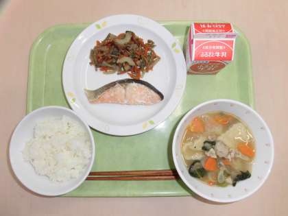 献立は、ごはん、鮭の塩焼き、五目きんぴら、すいとん、牛乳です。