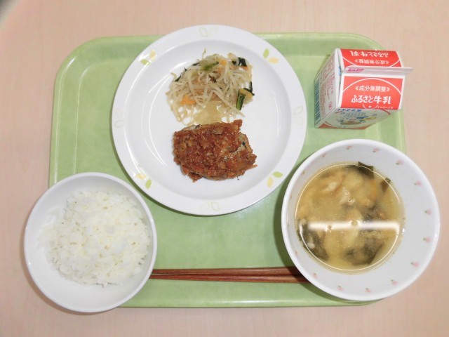 献立は、ごはん、豆腐入りハンバーグ、糸寒天と野菜の和え物、みそ汁、牛乳です。