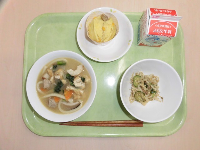 献立は、ちゃんこうどん、もやしときゅうりのごま風味、ウインナーとコーンの蒸しパン、牛乳です。