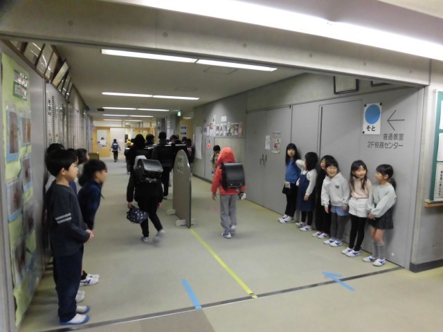 今日は雨天のため、靴箱前の廊下であいさつをしています。