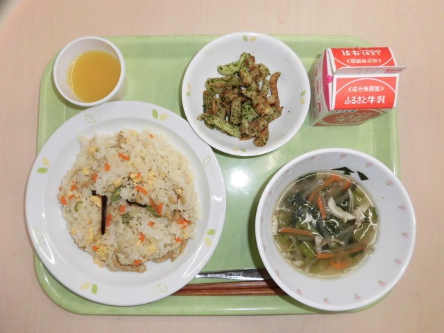 献立は、ちらしずし、青のりフライドポテト、沢煮椀、白桃ゼリー、牛乳です。