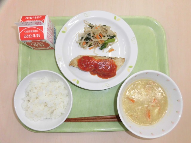 献立は、ごはん、魚のチリソース、三色ナムル、中華風コーンスープ、牛乳です。