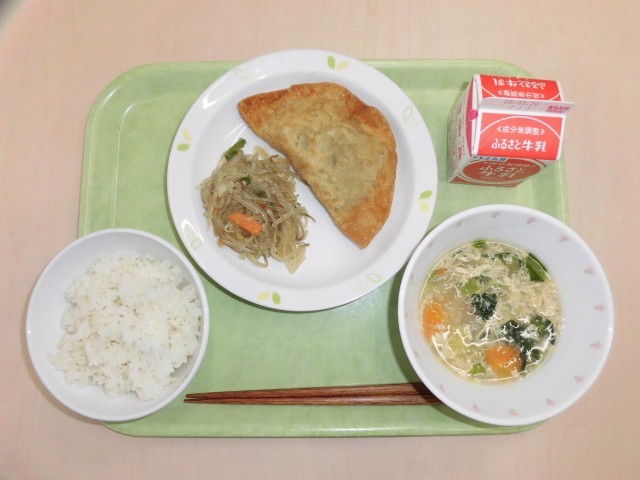献立は、麦ごはん、ツナ入りジャンボぎょうざ、春雨の肉野菜炒め、たまごと白菜のスープ、牛乳です。