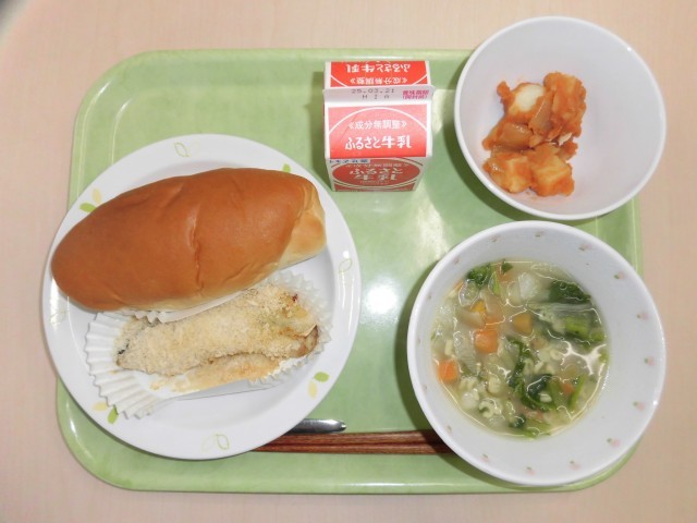 献立は、ミルクパン、魚のガーリック焼き、じゃがいものケチャップあえ、ABCスープ、牛乳です。