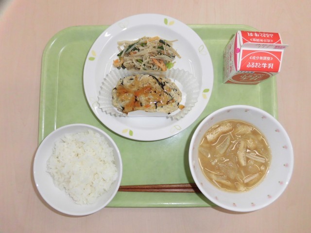 献立は、ごはん、おから入りさくさくつくね、野菜のごまあえ、みそ汁、牛乳です。