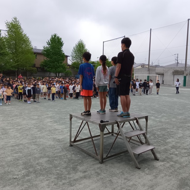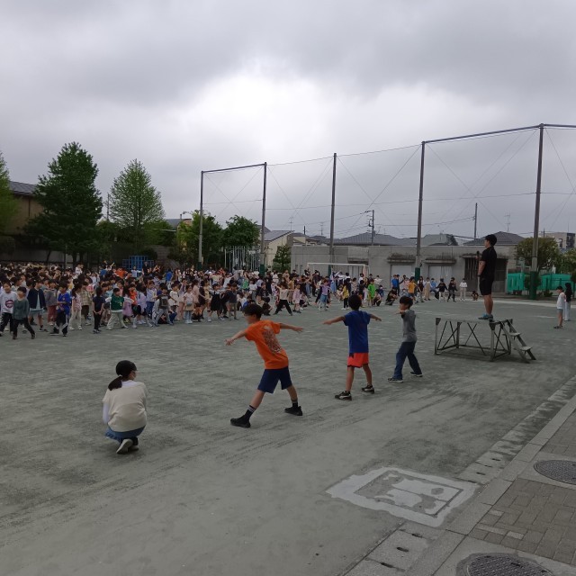 体育朝会を行いました。運動委員会がお手本になって、整列のしかたをやってみたり、みんなでからだじゃんけんをしたりしました。
